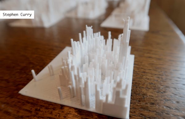 Another creative post from FlowingData. The above image is a 3-D printed heatmap of shots made by Steph Curry. The post contains around 20 similar prints, each with analyses like this: